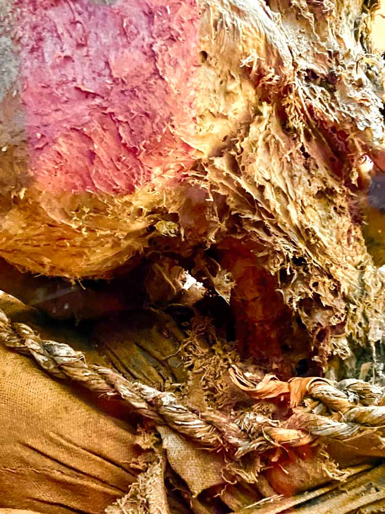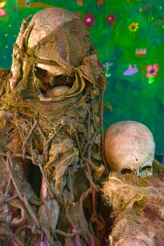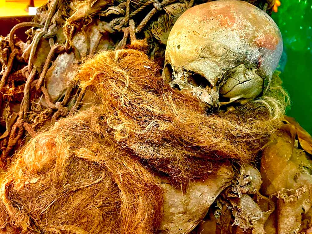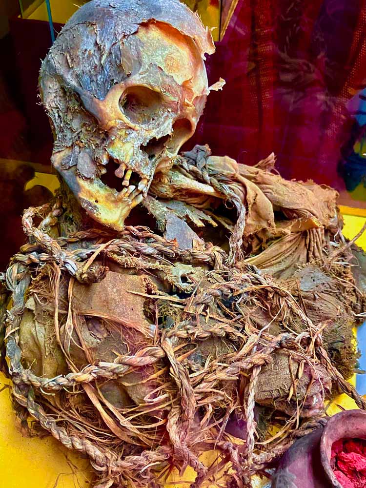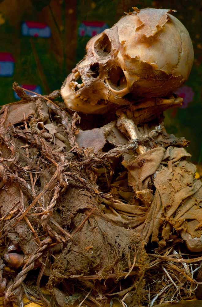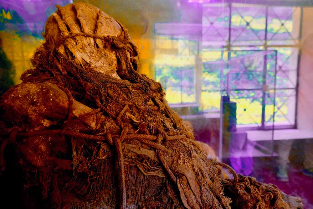 Aus der Dorfschule in den Bergen, wo sich das kleine Museum mit den ausgelagerten Mumien befindet, wurde eine Mumie gestohlen. Sie war diejenige, die am besten erhalten war. Daß Mumien antiker Europäer gestohlen werden, hörten wir auf unseren Reisen durch die Anden nicht zum ersten Mal. In Chachapoyas, einer Stadt in der Nähe, wurden ihre antiken Sarkophage zerstört. (siehe https://www.gundula-schulze-eldowy.com/wolkenkrieger/) Es sind bemalte Skulpturen mit Hohlraum. Sie enthielten Skelette oder Mumien, weniger Grabbeigaben. Für die Zerstörung kommen zwei Gründe in Betracht: 1. um Geschäfte zu machen und 2. um Beweise einer anderen Geschichte zu zerstören.