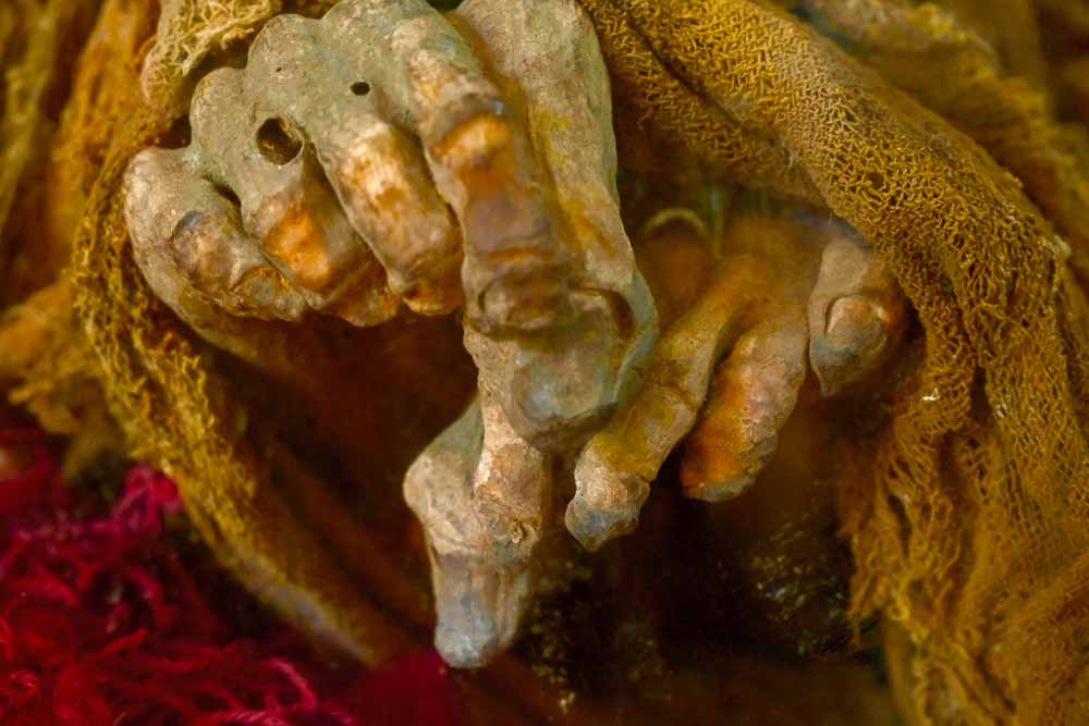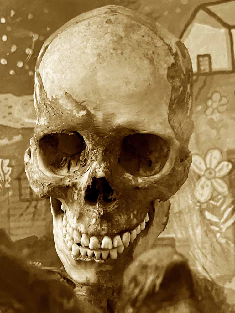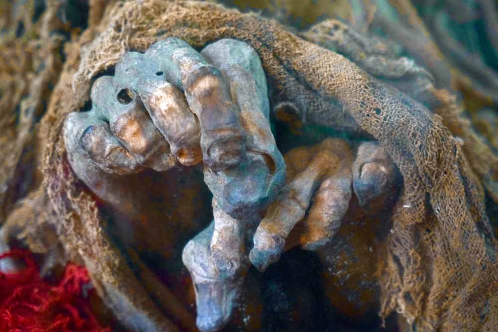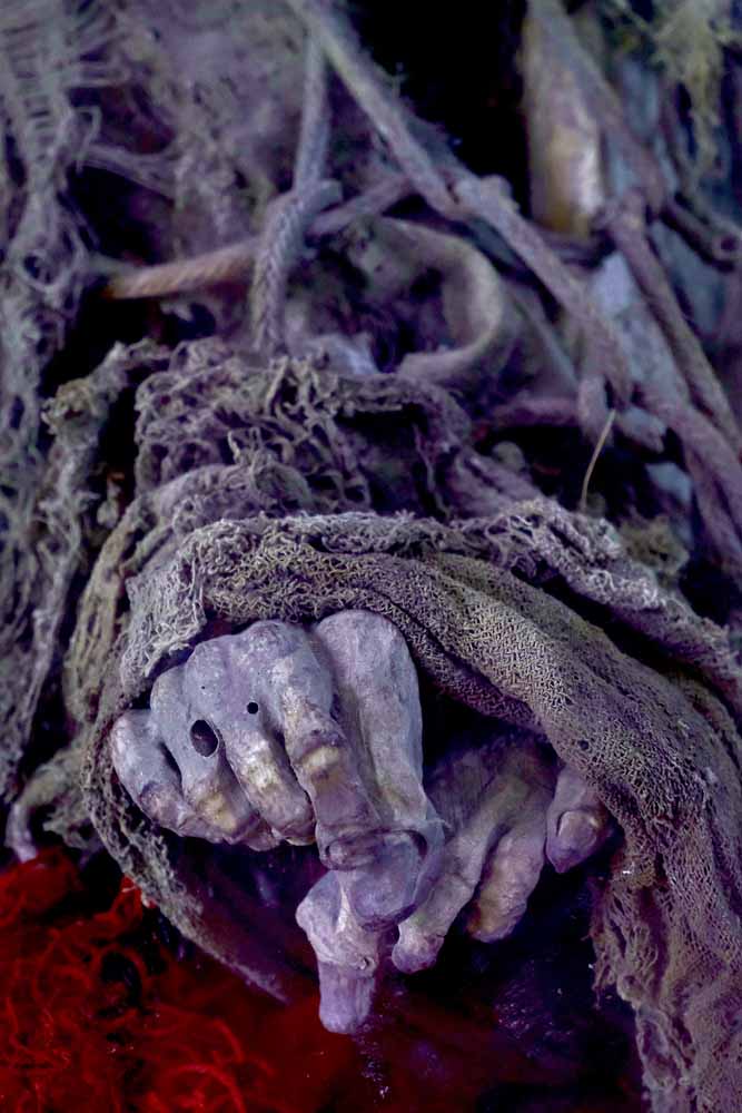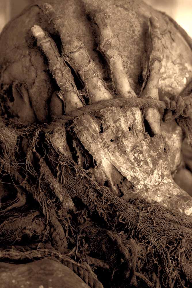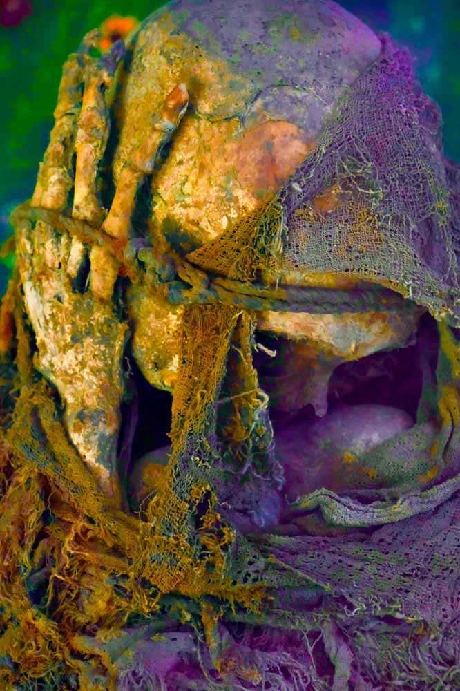 Aus der Dorfschule in den Bergen, wo sich das kleine Museum mit den ausgelagerten Mumien befindet, wurde eine Mumie gestohlen. Sie war diejenige, die am besten erhalten war. Daß Mumien antiker Europäer gestohlen werden, hörten wir auf unseren Reisen durch die Anden nicht zum ersten Mal. In Chachapoyas, einer Stadt in der Nähe, wurden ihre antiken Sarkophage zerstört. (siehe https://www.gundula-schulze-eldowy.com/wolkenkrieger/) Es sind bemalte Skulpturen mit Hohlraum. Sie enthielten Skelette oder Mumien, weniger Grabbeigaben. Für die Zerstörung kommen zwei Gründe in Betracht: 1. um Geschäfte zu machen und 2. um Beweise einer anderen Geschichte zu zerstören.