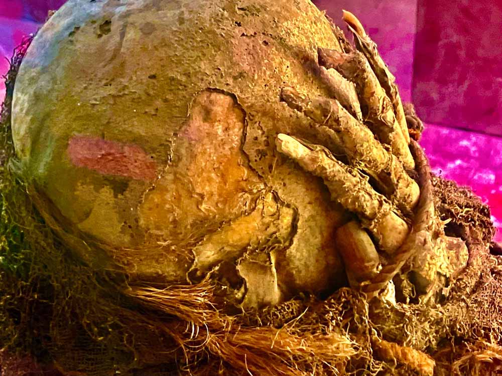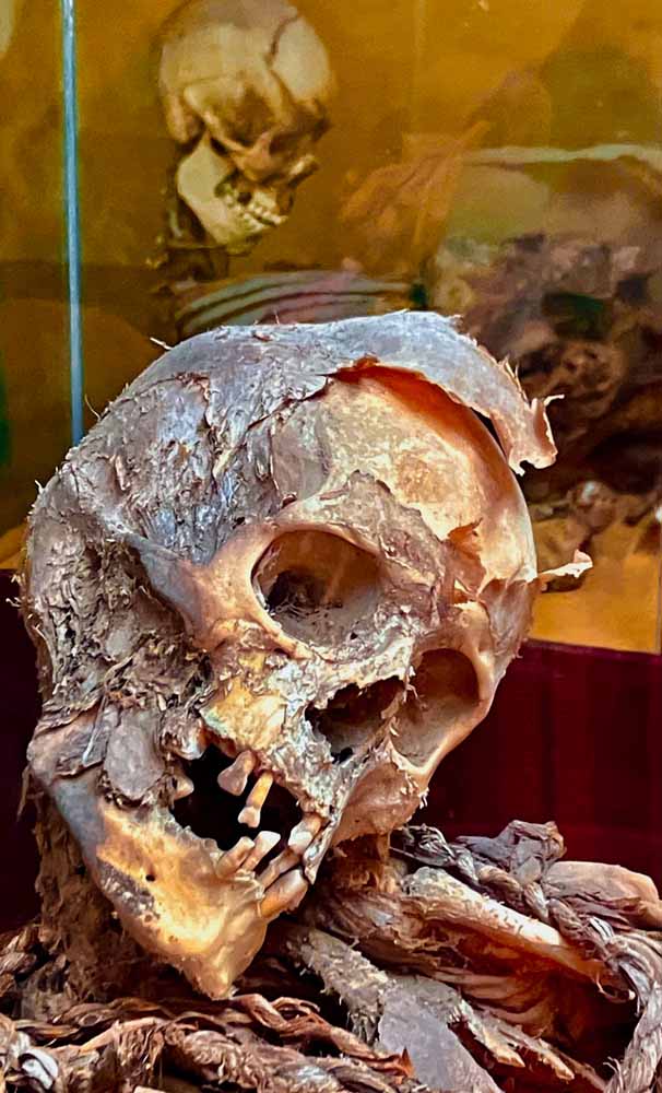Die Mumien des Cerros Gualgayoc wurden vor kurzem ausgelagert. In einer kleinen Dorfschule ist ein Museum mit den Mumien und ihrem Hab und Gut. Europäer sind als Cro-Magnon eine einzigartige Ethnie. Ihre Skelette und Schädel unterscheiden sich von denen der Stammeskulturen Perus. Beispielsweise ist ihre Kopfform rechteckig mit rechteckigen Augenhöhlen. Auf den Photographien ist dies sehr gut zu erkennen. Im Übrigen war es klug, die Mumien ausgelagert zu haben, denn es hatte 2025 in der Regenzeit heftiger als sonst geregnet. Sämtliche Grabkammern der Dolmengräber waren bei unserem Besuch überflutet. Das hätte die Zerstörung der Mumien bedeutet, wenn sie dort geblieben wären. Die Grabkammern haben polierte Wände und sind manchmal zweistöckig. Von den Erbauern wurden Wasserrinnen aus dem Felsen geschnitten, um das Regenwasser den Berg hinunter fließen zu lassen. Aber dieses Jahr funktionierten sie nicht, weil der Regen entsetzlich war. Es wurden ganze Ortschaften und Straßen überflutet, Autos wurden fortgeschwemmt. Eine Bergspitze brach ab und stürzte in die Tiefe. Die Autostrasse von Trujillo nach Cajamarca war lange unpassierbar.
